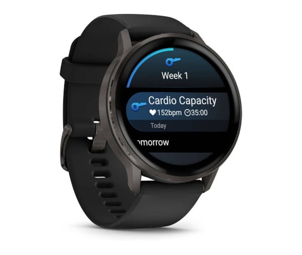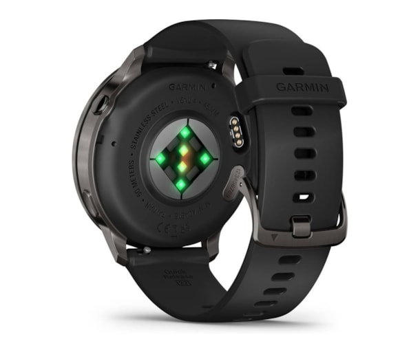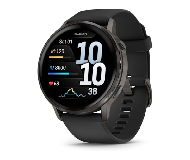O Garmin Venu 4 – Cinza 45 mm destaca-se com o seu elegante acabamento escuro e a sua confortável bracelete em silicone preta. Maior do que a versão de 41 mm, foi concebido para quem procura um visual desportivo e elegante sem abdicar do estilo. Seja na cidade ou ao ar livre, adapta-se naturalmente ao seu dia a dia.