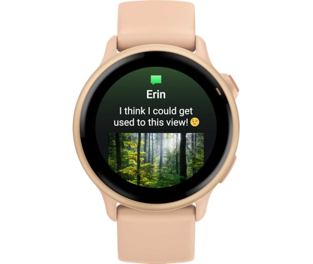 Recebe e-mails, mensagens de texto e alertas no relógio quando estiver vinculado a um smartphone Android ou iPhone. Com um telefone Android, poderás responder às mensagens de texto com o teclado do relógio e ver as fotos recebidas diretamente no ecrã do relógio.